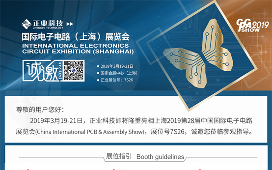 2019年3月19-21日,正業(yè)科技即將隆重亮相上海2019第28屆中國國際電子電路展覽會(China International PCB & Assembly Show),展位號7S26,誠邀您蒞臨參觀指導(dǎo)。